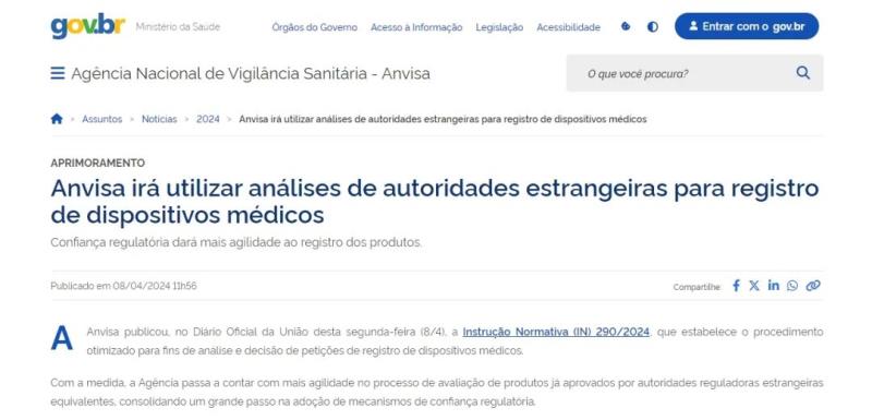 近日,Anvisa發(fā)布第290/2024號(hào)規(guī)范性指令,規(guī)定了審核和決定醫(yī)療器械注冊(cè)申請(qǐng)的簡(jiǎn)化程序經(jīng)認(rèn)可的海外監(jiān)管機(jī)構(gòu)澳洲、加拿大、美國(guó)、日本授權(quán)上市的Class Ⅲ、Class Ⅳ類(lèi)高風(fēng)險(xiǎn)醫(yī)療器械,可根據(jù)公司的申請(qǐng)縮短其在巴西注冊(cè)的審核時(shí)間。此簡(jiǎn)化程序的申請(qǐng)需提交相關(guān)文件,以證明進(jìn)入巴西市場(chǎng)的產(chǎn)品與經(jīng)認(rèn)可的監(jiān)管機(jī)構(gòu)批準(zhǔn)的產(chǎn)品有著相同的生產(chǎn)特征、適應(yīng)癥和預(yù)期用途。