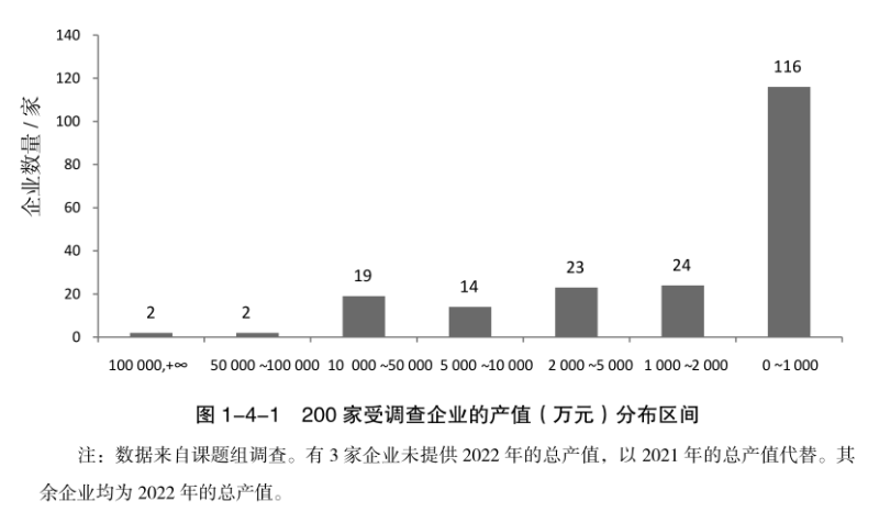 調(diào)查結(jié)果顯示,2022年,200家受調(diào)查注冊企業(yè)的總產(chǎn)值加總約為129.4億元(個別企業(yè)尚未公布2022年的總產(chǎn)值,以2021年的總產(chǎn)值代替),員工人數(shù)總計(jì)20029人,平均每家企業(yè)產(chǎn)值約為6460萬元,平均雇傭的員工人數(shù)為100人,人均產(chǎn)值約為64.6萬元。