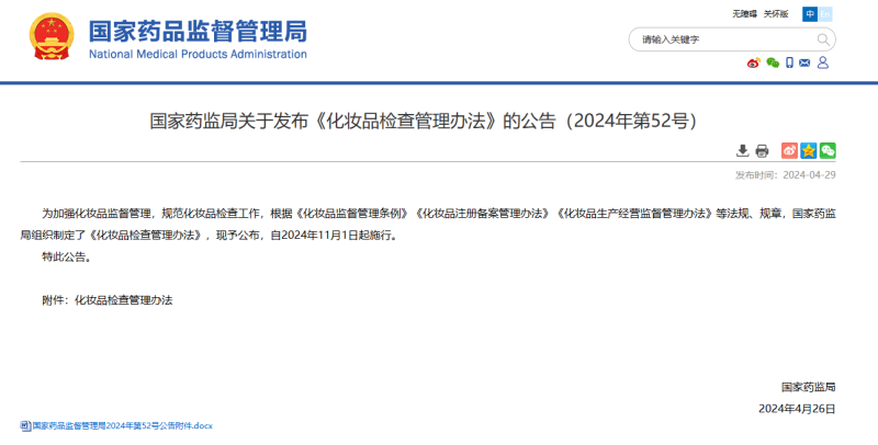 近日,國(guó)家藥監(jiān)局發(fā)布《化妝品監(jiān)督管理辦法》。這是我國(guó)化妝品監(jiān)管領(lǐng)域第一次系統(tǒng)地規(guī)范化妝品檢查工作,自2024年11月1日開(kāi)始實(shí)施。