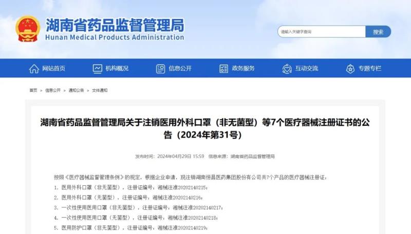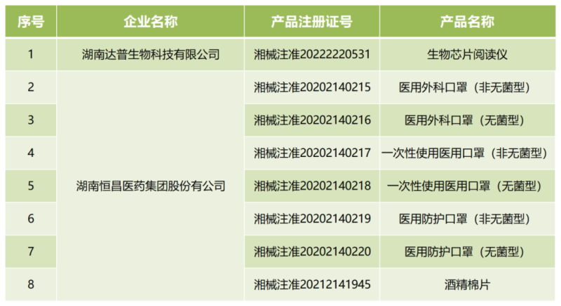 近日,湖南省藥監(jiān)局官網(wǎng)發(fā)布兩則公告稱,按照《醫(yī)療器械監(jiān)督管理條例》的規(guī)定,根據(jù)企業(yè)申請,該局已依法注銷湖南恒昌醫(yī)藥集團股份有公司、湖南達普生物科技有限公司2家企業(yè)的共計8個醫(yī)療器械注冊證書,包括醫(yī)用外科口罩、酒精棉片、生物芯片閱讀儀等產(chǎn)品,具體明細如下: