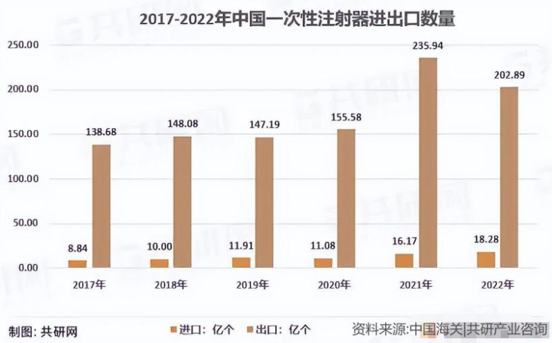 中國作為一次性注射器的生產(chǎn)大國和出口大國,其年出口數(shù)量在近年來有顯著增長。據(jù)共研網(wǎng)統(tǒng)計,2017-2022年期間,我國一次性注射器年出口數(shù)量從138.68億個增加到202.89億個。如果FDA全面禁止中國塑料注射器進入美國,無疑將給我國注射器出口帶來重大影響。