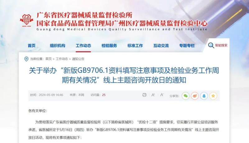 近日,廣東省醫(yī)療器械質(zhì)量監(jiān)督檢驗(yàn)所官網(wǎng)發(fā)布通知,定于5月16日(周四)舉辦“新版GB 9706.1資料填寫注意事項(xiàng)及檢驗(yàn)業(yè)務(wù)工作周期有關(guān)情況”線上主題咨詢開放日活動,具體時間及參會方式如下:
