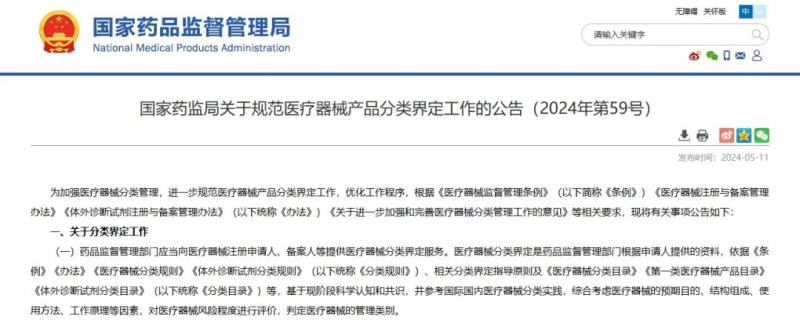 5月11日,國(guó)家藥監(jiān)局發(fā)布《關(guān)于規(guī)范醫(yī)療器械產(chǎn)品分類界定工作的公告(2024年第59號(hào))》,具體內(nèi)容如下: