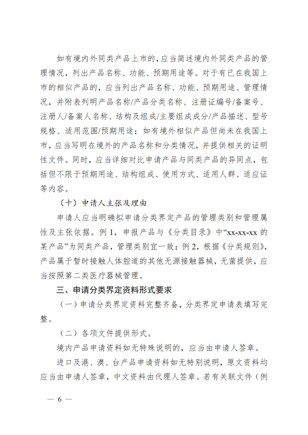 一、關(guān)于分類界定工作 (一)藥品監(jiān)督管理部門應(yīng)當(dāng)向醫(yī)療器械注冊(cè)申請(qǐng)人、備案人等提供醫(yī)療器械分類界定服務(wù)。醫(yī)療器械分類界定是藥品監(jiān)督管理部門根據(jù)申請(qǐng)人提供的資料,依據(jù)《醫(yī)療器械監(jiān)督管理?xiàng)l例》(以下簡(jiǎn)稱《條例》)《醫(yī)療器械注冊(cè)與備案管理辦法》《體外診斷試劑注冊(cè)與備案管理辦法》(以下統(tǒng)稱《辦法》)《醫(yī)療器械分類規(guī)則》《體外診斷試劑分類規(guī)則》(以下統(tǒng)稱《分類規(guī)則》)、相關(guān)分類界定指導(dǎo)原則及《醫(yī)療器械分類目錄》《第一類醫(yī)療器械產(chǎn)品目錄》《體外診斷試劑分類目錄》(以下統(tǒng)稱《分類目錄》)等,基于現(xiàn)階段科學(xué)認(rèn)知和共識(shí),并參考國(guó)際國(guó)內(nèi)醫(yī)療器械分類實(shí)踐,綜合考慮醫(yī)療器械的預(yù)期目的、結(jié)構(gòu)組成、使用方法、工作原理等因素,對(duì)醫(yī)療器械風(fēng)險(xiǎn)程度進(jìn)行評(píng)價(jià),判定醫(yī)療器械的管理類別。 (二)申請(qǐng)人應(yīng)當(dāng)依據(jù)《條例》《辦法》《分類規(guī)則》、相關(guān)分類界定指導(dǎo)原則及《分類目錄》等判定產(chǎn)品管理屬性和類別。對(duì)新研制的尚未列入《分類目錄》的醫(yī)療器械,申請(qǐng)人可以直接申請(qǐng)第三類醫(yī)療器械產(chǎn)品注冊(cè),也可以依據(jù)《分類規(guī)則》判斷產(chǎn)品類別并申請(qǐng)分類界定后,申請(qǐng)產(chǎn)品注冊(cè)或者辦理產(chǎn)品備案。 對(duì)于新研制的尚未列入《分類目錄》的醫(yī)療器械或者管理類別存疑的醫(yī)療器械,需要藥品監(jiān)管部門明確分類界定意見(jiàn)從而申請(qǐng)注冊(cè)或者辦理備案的,申請(qǐng)人應(yīng)當(dāng)通過(guò)分類界定信息系統(tǒng)提出分類界定申請(qǐng)。申請(qǐng)人應(yīng)當(dāng)已完成產(chǎn)品的前期研究、具有基本定型產(chǎn)品,并確保分類界定申請(qǐng)資料的合法、真實(shí)、準(zhǔn)確、完整和可追溯。 新研制的尚未列入《分類目錄》的醫(yī)療器械,是指與《分類目錄》中產(chǎn)品(根據(jù)產(chǎn)品描述、預(yù)期用途和品名舉例進(jìn)行綜合判定)和已上市產(chǎn)品相比,產(chǎn)品的主要原材料、生產(chǎn)工藝、工作原理、結(jié)構(gòu)組成、使用方法、接觸部位及接觸時(shí)間、預(yù)期目的等均為全新且尚未在我國(guó)上市的醫(yī)療器械。 管理類別存疑的醫(yī)療器械,是指同類產(chǎn)品已在我國(guó)上市或者已列入《分類目錄》,但與《分類目錄》中同類產(chǎn)品或者已上市同類產(chǎn)品相比,產(chǎn)品的主要原材料、生產(chǎn)工藝、工作原理、結(jié)構(gòu)組成、使用方法、接觸部位及接觸時(shí)間、預(yù)期目的等發(fā)生了變化,引入了新的風(fēng)險(xiǎn)或者增加了產(chǎn)品風(fēng)險(xiǎn),可能導(dǎo)致產(chǎn)品分類發(fā)生變化的醫(yī)療器械。 (三)對(duì)于新研制的尚未列入《分類目錄》的醫(yī)療器械分類界定申請(qǐng),申請(qǐng)人在分類界定信息系統(tǒng)中提交至國(guó)家藥品監(jiān)督管理局醫(yī)療器械標(biāo)準(zhǔn)管理中心(以下簡(jiǎn)稱器械標(biāo)管中心)。 器械標(biāo)管中心負(fù)責(zé)組織研究明確分類界定意見(jiàn),通過(guò)分類界定信息系統(tǒng)將分類界定結(jié)果告知申請(qǐng)人,并及時(shí)按照程序調(diào)整《醫(yī)療器械分類目錄》。 (四)對(duì)于管理類別存疑的境內(nèi)醫(yī)療器械分類界定申請(qǐng),申請(qǐng)人在分類界定信息系統(tǒng)中提交至所在地省級(jí)藥品監(jiān)督管理部門。省級(jí)藥品監(jiān)督管理部門負(fù)責(zé)對(duì)行政區(qū)域內(nèi)申請(qǐng)人提出的產(chǎn)品分類界定申請(qǐng)進(jìn)行審查,根據(jù)《條例》《分類規(guī)則》、相關(guān)分類界定指導(dǎo)原則及《分類目錄》等能夠明確判定產(chǎn)品管理類別的,通過(guò)分類界定信息系統(tǒng)將分類界定結(jié)果告知申請(qǐng)人;難以明確判定產(chǎn)品管理類別的,提出預(yù)分類界定意見(jiàn),并通過(guò)分類界定信息系統(tǒng)報(bào)器械標(biāo)管中心。 器械標(biāo)管中心與國(guó)家藥品監(jiān)督管理局醫(yī)療器械技術(shù)審評(píng)中心(以下簡(jiǎn)稱國(guó)家藥監(jiān)局器審中心)、省級(jí)藥品監(jiān)督管理部門建立醫(yī)療器械分類溝通協(xié)調(diào)機(jī)制,統(tǒng)籌指導(dǎo)省級(jí)藥品監(jiān)督管理部門醫(yī)療器械分類界定工作。 對(duì)于管理類別存疑的進(jìn)口及港、澳、臺(tái)產(chǎn)品醫(yī)療器械分類界定申請(qǐng),申請(qǐng)人在分類界定信息系統(tǒng)中提交至器械標(biāo)管中心。 器械標(biāo)管中心負(fù)責(zé)對(duì)管理類別存疑的進(jìn)口及港、澳、臺(tái)產(chǎn)品醫(yī)療器械分類界定申請(qǐng)和省級(jí)藥品監(jiān)督管理部門出具預(yù)分類界定意見(jiàn)的醫(yī)療器械分類界定申請(qǐng)組織研究,明確分類界定意見(jiàn),并通過(guò)分類界定信息系統(tǒng)將分類界定結(jié)果告知申請(qǐng)人。 (五)醫(yī)療器械分類技術(shù)委員會(huì)按照《國(guó)家藥品監(jiān)督管理局醫(yī)療器械分類技術(shù)委員會(huì)工作規(guī)則