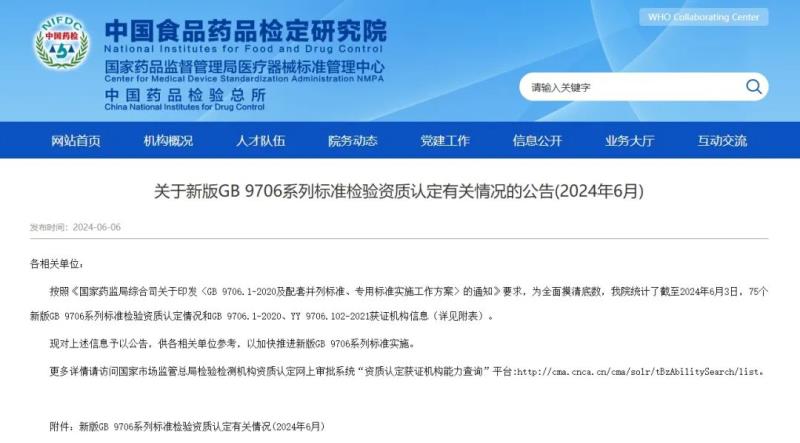 6月6日,中檢院官網(wǎng)公布了截至2024年6月3日,75個(gè)新版GB 9706系列標(biāo)準(zhǔn)檢驗(yàn)資質(zhì)認(rèn)定情況和GB 9706.1-2020、YY 9706.102-2021獲證機(jī)構(gòu)信息。