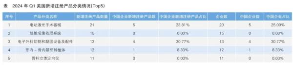 從整體注冊(cè)情況來看,2024年一季度,中國企業(yè)在美國獲批醫(yī)療器械產(chǎn)品中,“經(jīng)皮神經(jīng)電刺激儀(用于非處方用途)”的產(chǎn)品數(shù)量最多;其次是“電動(dòng)激光手術(shù)器械”,產(chǎn)品數(shù)量為5件,占該分類新注冊(cè)產(chǎn)品總數(shù)的23.81%,涉及中國企業(yè)5家,占該分類注冊(cè)企業(yè)總數(shù)的25.00%。