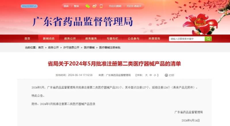 近日,廣東省藥監(jiān)局發(fā)布公告稱,2024年5月,廣東省藥監(jiān)局共批準注冊醫(yī)療器械產(chǎn)品251個,其中首次注冊127個,延續(xù)注冊124個。