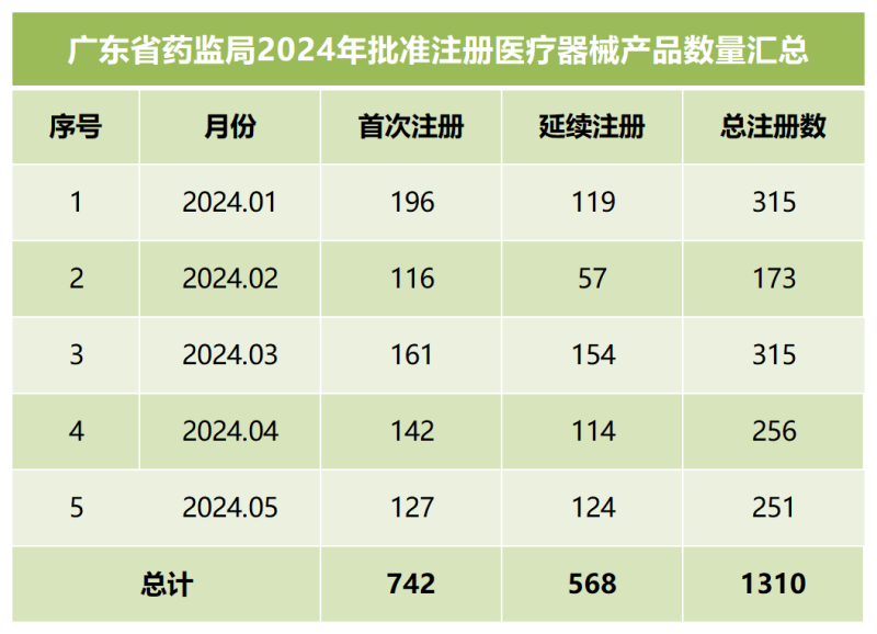 我們同步匯總了2024年前5個月廣東省藥監(jiān)局批準注冊的醫(yī)療器械產(chǎn)品數(shù)量(見下方表格),從表格中可以看出,截至5月底,2024年廣東省藥監(jiān)局總計批準注冊第二類醫(yī)療器械產(chǎn)品1310,其中首次注冊742個,延續(xù)注冊568