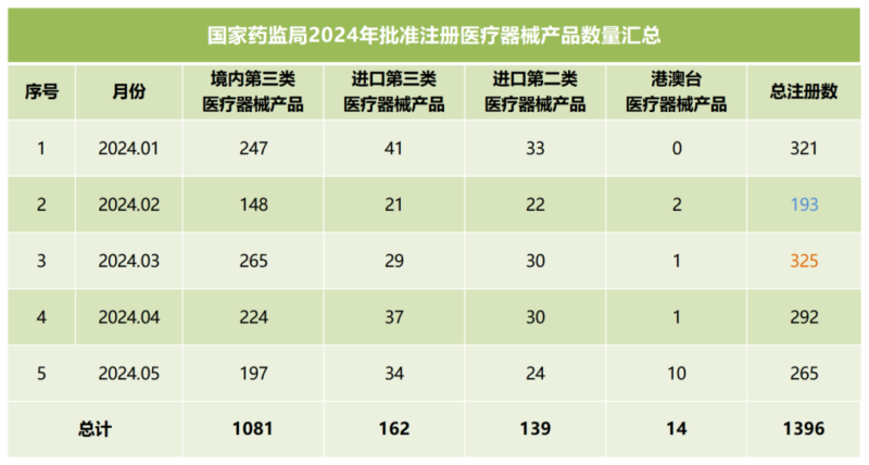 我們同步匯總了2024年前五個月國家藥監(jiān)局批準(zhǔn)注冊的醫(yī)療器械產(chǎn)品數(shù)量(見下方表格),從表格中可以看出,截至5月,2024年國家藥監(jiān)局總計(jì)批準(zhǔn)注冊醫(yī)療器械產(chǎn)品1396個,其中境內(nèi)第三類醫(yī)療器械產(chǎn)品1081個,進(jìn)口第三類醫(yī)療器械產(chǎn)品162個,進(jìn)口第二類醫(yī)療器械產(chǎn)品139個,港澳臺醫(yī)療器械產(chǎn)品14個。