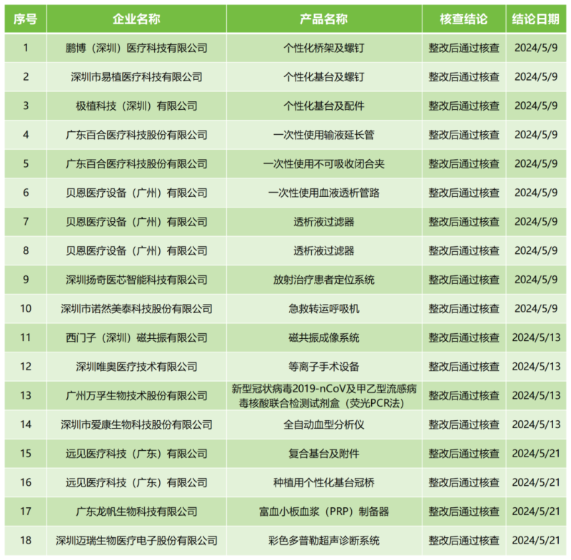 6月25日,廣東省藥監(jiān)局官網(wǎng)公布2024年5月醫(yī)療器械注冊(cè)質(zhì)量管理體系核查結(jié)果,包括西門(mén)子(深圳)磁共振有限公司的磁共振成像系統(tǒng)、深圳唯奧醫(yī)療技術(shù)有限公司的等離子手術(shù)設(shè)備、深圳邁瑞生物醫(yī)療電子股份有限公司的彩色多普勒超聲診斷系統(tǒng)等共計(jì)18款產(chǎn)品,均為“整改后通過(guò)核查”。具體明細(xì)見(jiàn)下方表格: