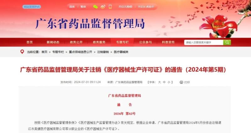 7月1日,廣東藥監(jiān)局發(fā)布通告稱,根據(jù)企業(yè)申請,該局于2024年5月依法注銷深圳市三諾電子有限公司、艾諾克醫(yī)美科技(珠海)有限公司、深圳市紐泰克電子有限公司等18家企業(yè)的《醫(yī)療器械生產(chǎn)許可證》。具體清單如下: