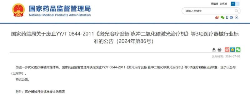 7月8日,國家藥監(jiān)局發(fā)布公告稱,廢止YY/T 0844-2011《激光治療設(shè)備 脈沖二氧化碳激光治療機》等3項醫(yī)療器械行業(yè)標準,具體明細如下: