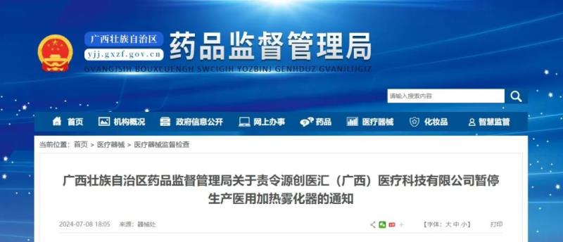 近日,廣西壯族自治區(qū)藥監(jiān)局發(fā)布《關(guān)于責(zé)令源創(chuàng)醫(yī)匯(廣西)醫(yī)療科技有限公司暫停生產(chǎn)醫(yī)用加熱霧化器的通知》,其中提到,該局于2024年6月28-30日組織檢查組對(duì)源創(chuàng)醫(yī)匯(廣西)醫(yī)療科技有限公司進(jìn)行飛行檢查,發(fā)現(xiàn)該企業(yè)質(zhì)量管理體系主要存在以下缺陷: