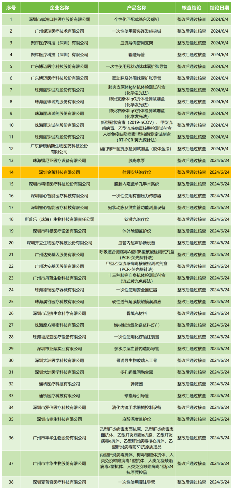 7月16日,廣東省藥監(jiān)局官網(wǎng)公布2024年6月醫(yī)療器械注冊(cè)質(zhì)量管理體系核查結(jié)果,包括深圳市家鴻口腔醫(yī)療股份有限公司的個(gè)性化匹配式基臺(tái)及螺釘、珠海福尼亞醫(yī)療設(shè)備有限公司的胰島素泵、深圳金茉科技有限公司的射頻皮膚治療儀等共計(jì)38款產(chǎn)品,均為“整改后通過核查”。具體明細(xì)見下方表格: