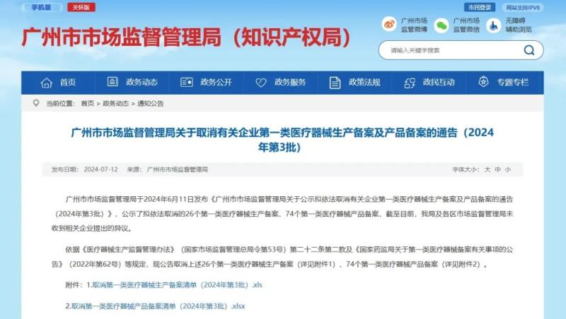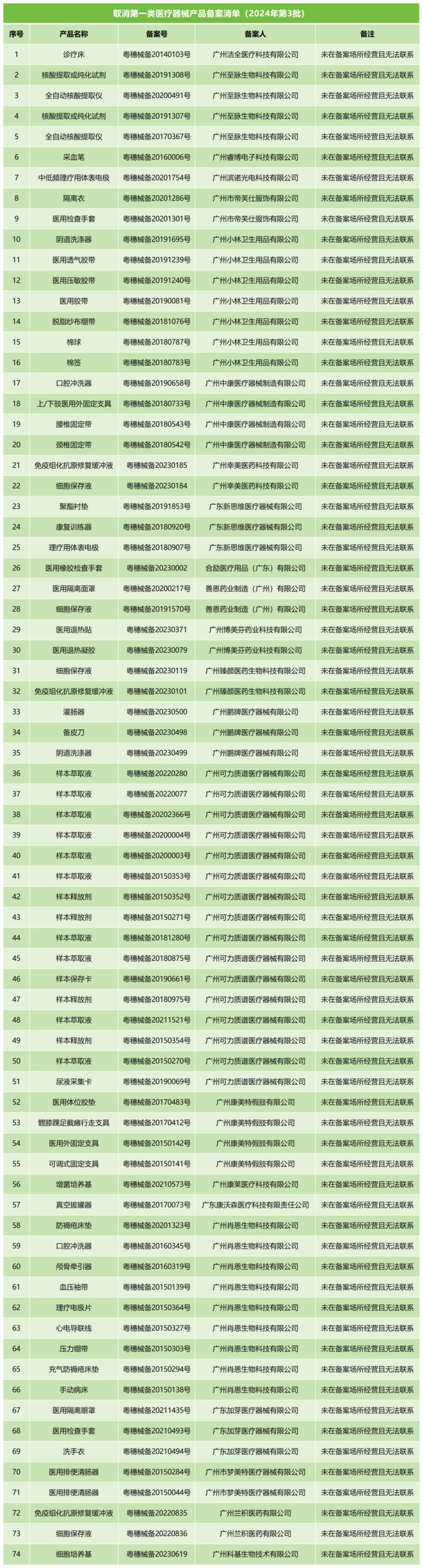 近日,廣州市市場監(jiān)督管理局官網(wǎng)發(fā)布一則取消第一類醫(yī)療器械生產(chǎn)備案及產(chǎn)品備案的通告,通告指出,因廣州至脈生物科技有限公司、廣州小林衛(wèi)生用品有限公司、廣州中康醫(yī)療器械制造有限公司等第一類醫(yī)械產(chǎn)品備案人未在備案場所經(jīng)營且無法聯(lián)系,該局在公示期結(jié)束后決定取消這些企業(yè)名下的74個第一類醫(yī)療器械產(chǎn)品備案,具體明細如下: