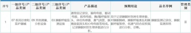 睡眠呼吸監(jiān)測(cè)儀在我國(guó)作為第二類醫(yī)療器械管理,其產(chǎn)品描述如下:“通常由記錄儀、腦電電極、眼動(dòng)電極、肌電電極、胸/腹呼吸探頭、體位傳感器、鼻氣流管、脈搏血氧探頭和心電電極等組成。記錄睡眠時(shí)的生理參數(shù)進(jìn)行分析”,預(yù)期用途為“用于記錄睡眠時(shí)各種生理參數(shù),對(duì)睡眠障礙、睡眠呼吸紊亂和睡眠呼吸暫停、低通氣綜合征疾病進(jìn)行分析、診斷”,常見(jiàn)名稱還有“睡眠監(jiān)測(cè)記錄儀”“睡眠監(jiān)測(cè)系統(tǒng)”等,分類編碼07-09-03。