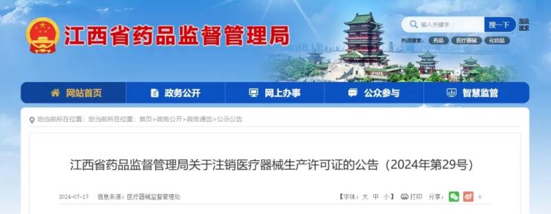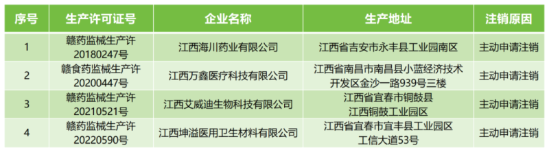 7月17日,江西省藥監(jiān)局發(fā)布公告稱,該局已依法注銷江西海川藥業(yè)有限公司、江西萬(wàn)鑫醫(yī)療科技有限公司等4家企業(yè)的《醫(yī)療器械生產(chǎn)許可證》,注銷原因均為“企業(yè)主動(dòng)申請(qǐng)注銷”,具體明細(xì)如下:
