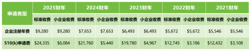接下來,我們將近幾年來的企業(yè)注冊年費和510(k)申請費匯總至下方表格,從表格可以看出,這兩項費用每年都有上漲,其中510(k)申請費(標準收費)從2021財年的$12432到2025財年的$24335,漲幅接近100%: