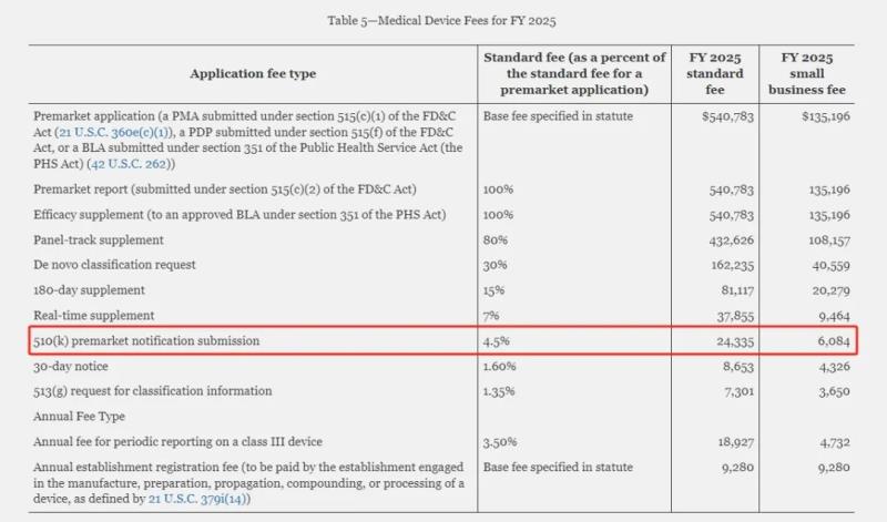 具體來說,企業(yè)注冊年費漲至$9280,相比2023財年的$7653上漲了$1627,漲幅21.2%;510(k)申請費(標準收費)漲至$24335,相比2023財年的$21760上漲了$2575,漲幅11.8%。當然,如果申請了小企業(yè)資質(zhì),企業(yè)的510(k)申請費是會便宜很多的,2025財年是6084美元(2024財年則是5440美元)。