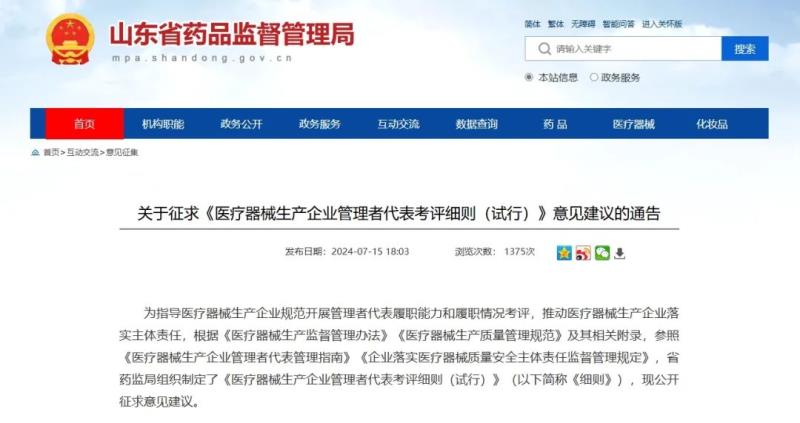 近日,山東省藥監(jiān)局發(fā)布《醫(yī)療器械生產(chǎn)企業(yè)管理者代表考評細(xì)則(試行)》(以下簡稱《細(xì)則》),并向社會公開征求意見建議。