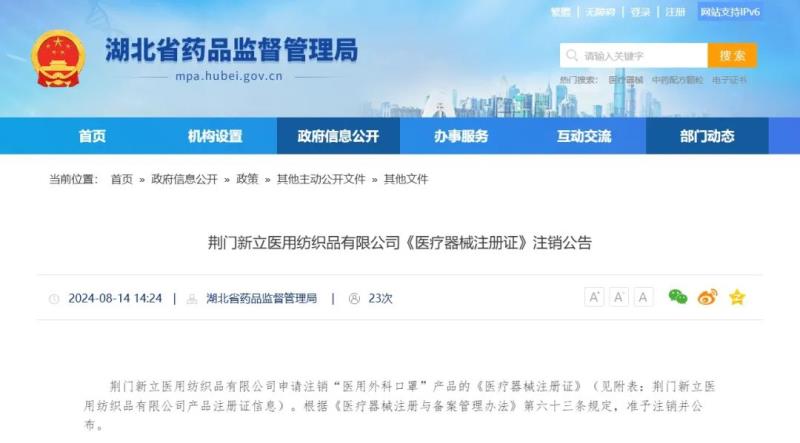 近日,湖北省藥監(jiān)局發(fā)布了幾則注銷公告,其中提到,由于荊門新立醫(yī)用紡織品有限公司主動申請注銷其持有的幾張注冊證(含醫(yī)用外科口罩、一次性手術(shù)中單等產(chǎn)品),根據(jù)《醫(yī)療器械注冊與備案管理辦法》第六十三條規(guī)定,準(zhǔn)予注銷并公布,具體明細(xì)如下: