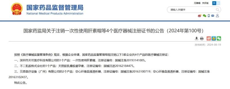 8月19日,國家藥監(jiān)局發(fā)布一則醫(yī)療器械注冊(cè)證注銷公告,公告顯示,該局已依法注銷深圳市天可醫(yī)療科技有限公司、貝恩醫(yī)療設(shè)備(廣州)有限公司等3家企業(yè)共計(jì)4個(gè)產(chǎn)品的醫(yī)療器械注冊(cè)證,具體如下:
