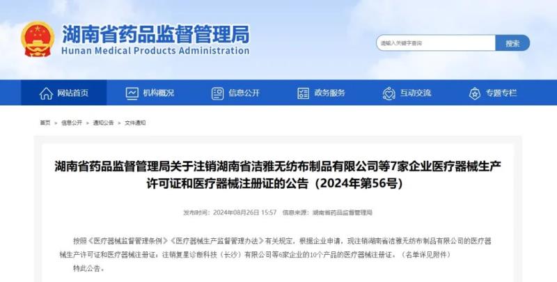 8月26日,湖南省藥監(jiān)局發(fā)布公告稱,按照《醫(yī)療器械監(jiān)督管理?xiàng)l例》《醫(yī)療器械生產(chǎn)監(jiān)督管理辦法》有關(guān)規(guī)定,根據(jù)企業(yè)申請(qǐng),現(xiàn)注銷湖南省潔雅無(wú)紡布制品有限公司的醫(yī)療器械生產(chǎn)許可證和醫(yī)療器械注冊(cè)證;注銷復(fù)星診斷科技(長(zhǎng)沙)有限公司6家企業(yè)的10個(gè)產(chǎn)品的醫(yī)療器械注冊(cè)證,具體明細(xì)如下: