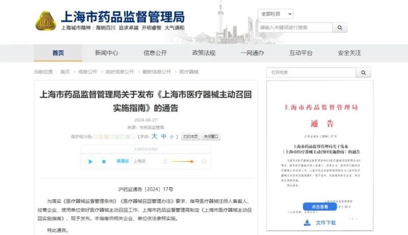 上海藥監(jiān)局發(fā)布《上海市醫(yī)療器械主動(dòng)召回實(shí)施指南》