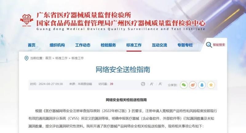 近日,廣東省醫(yī)療器械質(zhì)量監(jiān)督檢驗所就醫(yī)療器械產(chǎn)品網(wǎng)絡(luò)安全相關(guān)檢驗送檢事項公布如下: