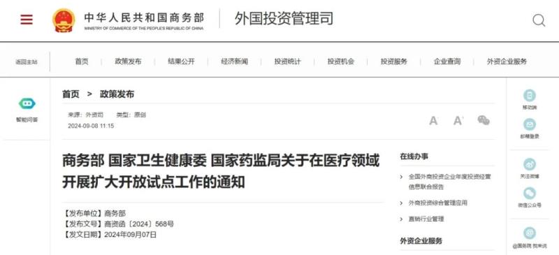 9月8日,商務部、國家衛(wèi)生健康委、國家藥監(jiān)局聯(lián)合發(fā)布《關于在醫(yī)療領域開展擴大開放試點工作的通知》,以擴大開放促進我國醫(yī)療相關領域高質(zhì)量發(fā)展,更好滿足人民群眾醫(yī)療健康需求。以下為該通知具體內(nèi)容:
