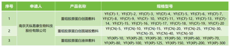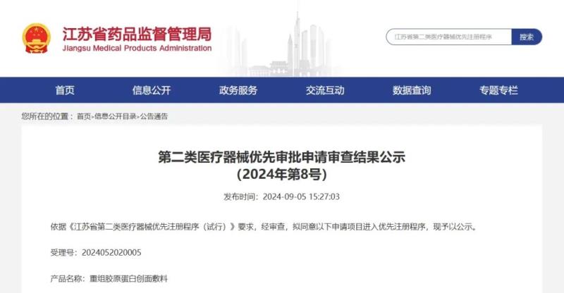 近日,江蘇省藥監(jiān)局發(fā)布《第二類醫(yī)療器械優(yōu)先審批申請審查結(jié)果公示(2024年第8號(hào))》,共有3款重組膠原蛋白敷料產(chǎn)品,具體如下:
