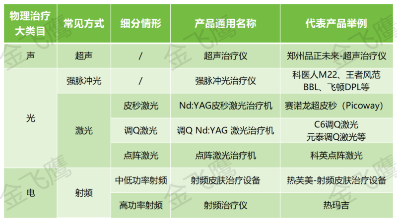 對(duì)醫(yī)療器械行業(yè)稍有了解的朋友應(yīng)該都聽(tīng)過(guò)“聲光電”,這是幾種物理治療方式的簡(jiǎn)稱(chēng),它們在醫(yī)美產(chǎn)品領(lǐng)域的應(yīng)用極為廣泛。這里的“聲”指的是超聲;“光”的形式則有多種,如激光、強(qiáng)脈沖光、紅藍(lán)光、紫光等,而就激光來(lái)說(shuō),又分為皮秒激光、調(diào)Q激光、點(diǎn)陣激光等,強(qiáng)脈沖光常見(jiàn)代表性產(chǎn)品則有M22、BBL、王者風(fēng)范等;電學(xué)類(lèi)產(chǎn)品最常見(jiàn)的則是熱瑪吉,主要利用電能作用于人體組織產(chǎn)生熱效應(yīng),以實(shí)現(xiàn)減輕皮膚皺紋等作用。
