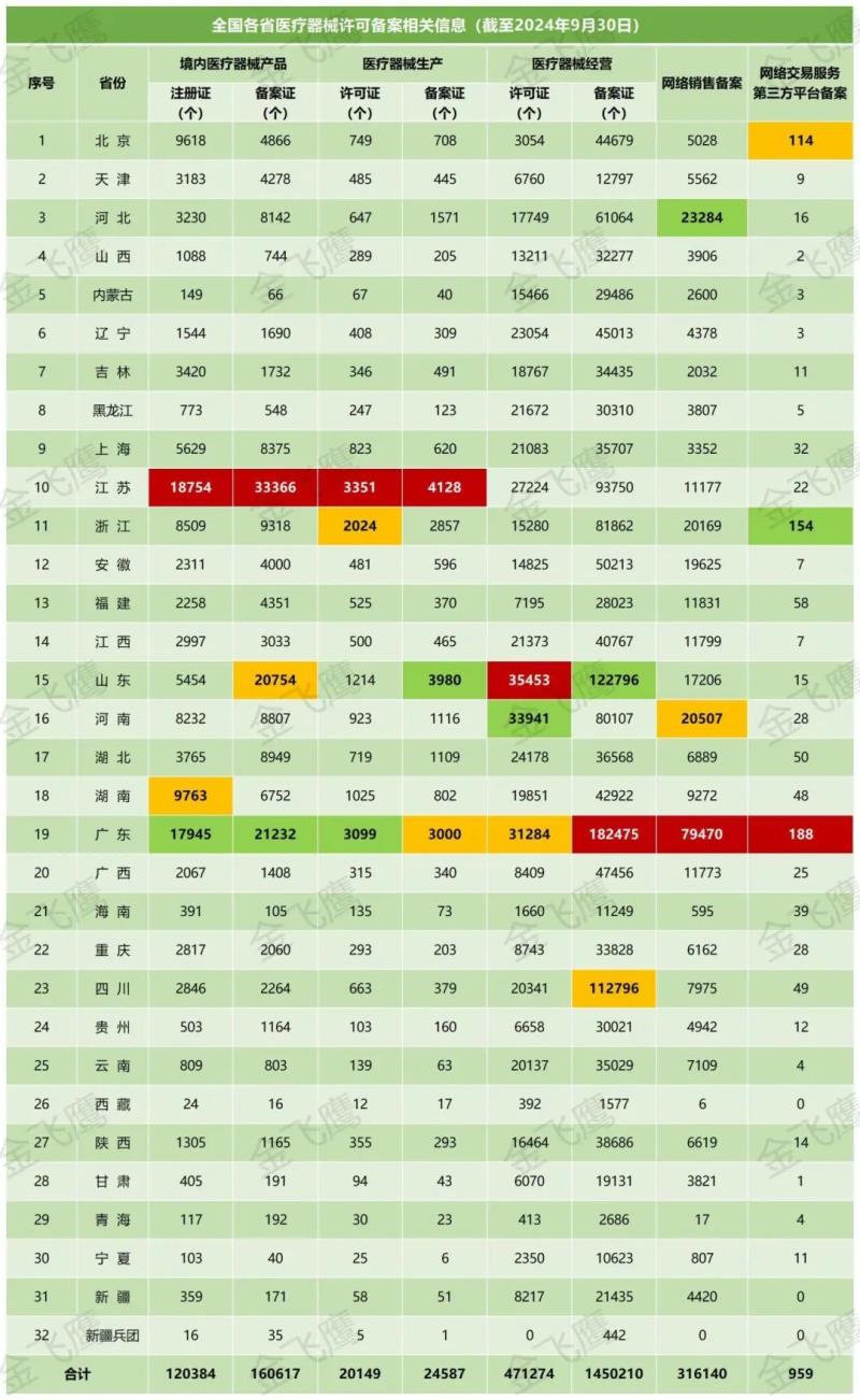 10月16日,國家藥監(jiān)局公布了截至2024年9月30日各省有效期內(nèi)醫(yī)療器械產(chǎn)品注冊(cè)備案、醫(yī)療器械生產(chǎn)企業(yè)許可備案等信息,老規(guī)矩,金飛鷹小編對(duì)此稍作編輯,標(biāo)注紅色、綠色、黃色的分別為前三甲。