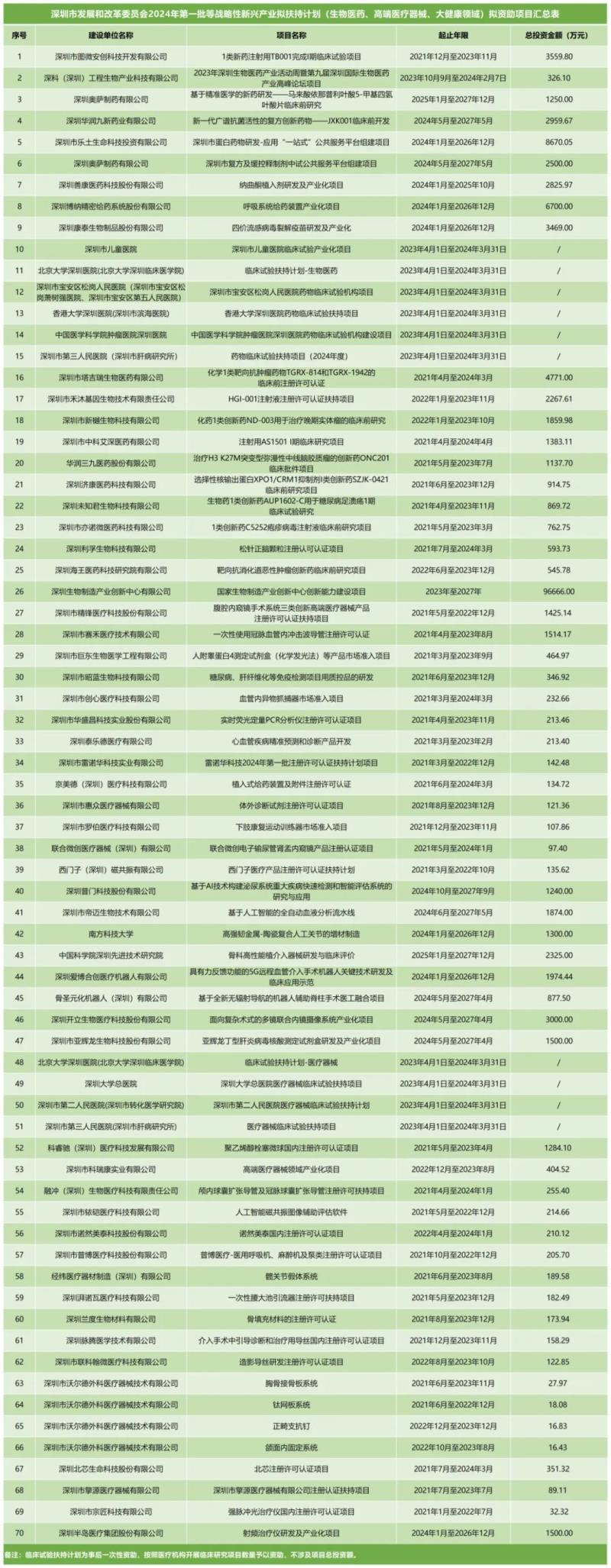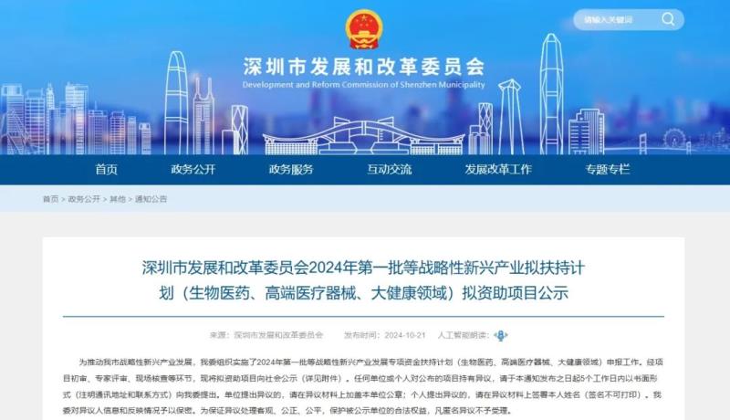 10月21日,深圳市發(fā)展和改革委員會(huì)發(fā)布了2024年第一批戰(zhàn)略性新興產(chǎn)業(yè)扶持計(jì)劃(生物醫(yī)藥、高端醫(yī)療器械、大健康領(lǐng)域)擬資助項(xiàng)目,公示時(shí)間為5個(gè)工作日。我們通過(guò)查閱附件表格后發(fā)現(xiàn),本批共有70個(gè)擬資助項(xiàng)目,包括醫(yī)藥領(lǐng)域臨床前研究、臨床試驗(yàn)扶持、注冊(cè)許可扶持等,總投資金額最高的為96666萬(wàn)元。深圳發(fā)改委將根據(jù)此前公布的相應(yīng)領(lǐng)域的專項(xiàng)資金項(xiàng)目申報(bào)指南,按總投資金額的一定比例對(duì)企業(yè)進(jìn)行補(bǔ)貼。
