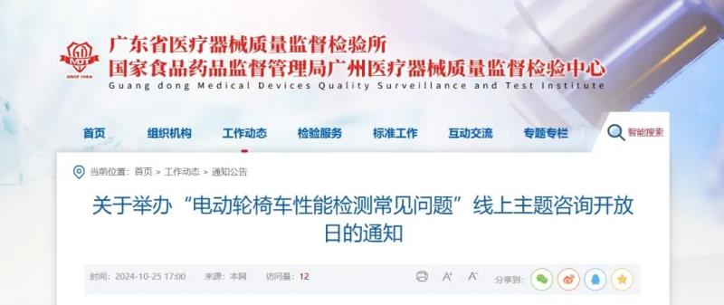 近日,廣東省醫(yī)療器械質(zhì)量監(jiān)督檢驗所官網(wǎng)發(fā)布通知,定于10月31日(周四)舉辦“電動輪椅車性能檢測常見問題”線上主題咨詢開放日活動,具體時間及參會方式如下: