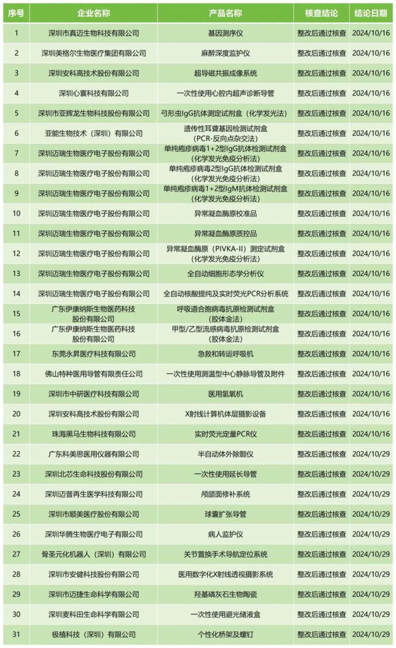 11月11日,廣東省藥監(jiān)局官網(wǎng)公布2024年10月醫(yī)療器械注冊(cè)質(zhì)量管理體系核查結(jié)果,包括深圳市真邁生物科技有限公司的基因測(cè)序儀、深圳市中研醫(yī)療科技有限公司的醫(yī)用氫氧機(jī)、廣東科美思醫(yī)用儀器有限公司的半自動(dòng)體外除顫儀等共計(jì)31款產(chǎn)品,核查結(jié)論均為“整改后通過核查”。具體明細(xì)見下方表格: