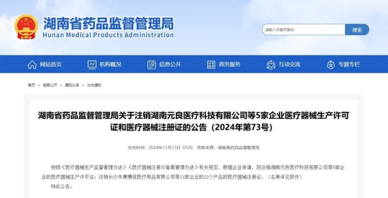11月13日,湖南省藥監(jiān)局發(fā)布公告稱,按照《醫(yī)療器械監(jiān)督管理條例》《醫(yī)療器械生產監(jiān)督管理辦法》有關規(guī)定,根據企業(yè)申請,現注銷湖南元良醫(yī)療科技有限公司等5家企業(yè)的醫(yī)療器械生產許可證;注銷長沙市康博佳醫(yī)療用品有限公司、湖南省健緣醫(yī)療科技有限公司等11家企業(yè)的23個產品(以醫(yī)用口罩居多)的醫(yī)療器械注冊證,具體明細如下: