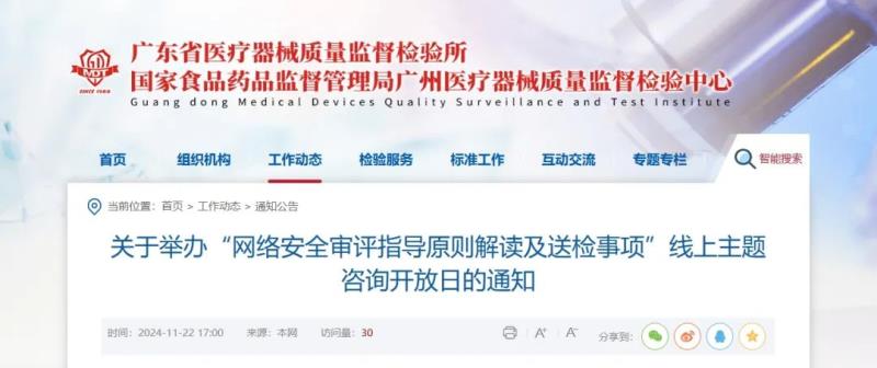 近日,廣東省醫(yī)療器械質(zhì)量監(jiān)督檢驗所官網(wǎng)發(fā)布通知,定于11月27日(周三)舉辦“網(wǎng)絡(luò)安全審評指導(dǎo)原則解讀及送檢事項”線上主題咨詢開放日活動,具體時間及參會方式如下: