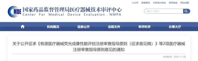 11月28日,國(guó)家藥監(jiān)局器審中心發(fā)布《有源醫(yī)療器械熒光成像性能評(píng)估注冊(cè)審查指導(dǎo)原則(征求意見稿)》《二氧化碳激光治療設(shè)備注冊(cè)審查指導(dǎo)原則(征求意見稿)》等2項(xiàng)指導(dǎo)原則,并向社會(huì)公開征求意見。