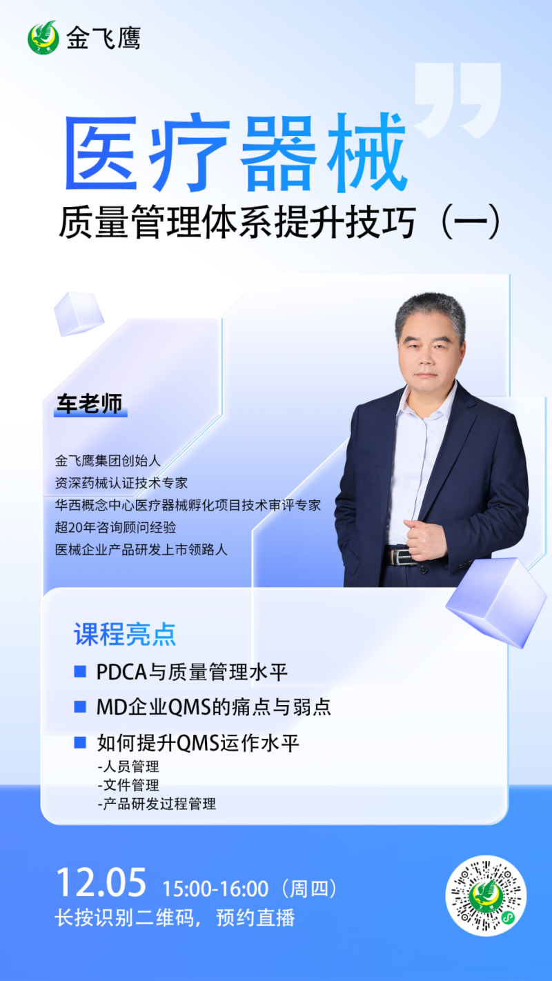金飛鷹直播培訓(xùn)簡(jiǎn)介 金飛鷹直播培訓(xùn),是每周一次的固定培訓(xùn)欄目,優(yōu)選金飛鷹國(guó)內(nèi)外資深注冊(cè)/項(xiàng)目老師定期為大家講解醫(yī)療器械注冊(cè)相關(guān)知識(shí),解答大家在醫(yī)療器械注冊(cè)過(guò)程中的諸多疑問(wèn)。 此前我們已為大家?guī)?lái)新版醫(yī)療器械生物學(xué)評(píng)價(jià)標(biāo)準(zhǔn)、新版醫(yī)療器械風(fēng)險(xiǎn)管理標(biāo)準(zhǔn)、醫(yī)療器械軟件注冊(cè)、新版醫(yī)療器械經(jīng)營(yíng)質(zhì)量管理規(guī)范等共計(jì)105次線上培訓(xùn)課程,有興趣的可點(diǎn)擊視頻號(hào)直播回放進(jìn)行查看~另外大家也一定很關(guān)注接下來(lái)的培訓(xùn)主題,相關(guān)培訓(xùn)預(yù)告我們會(huì)陸續(xù)添加至視頻號(hào),請(qǐng)大家持續(xù)關(guān)注哦!