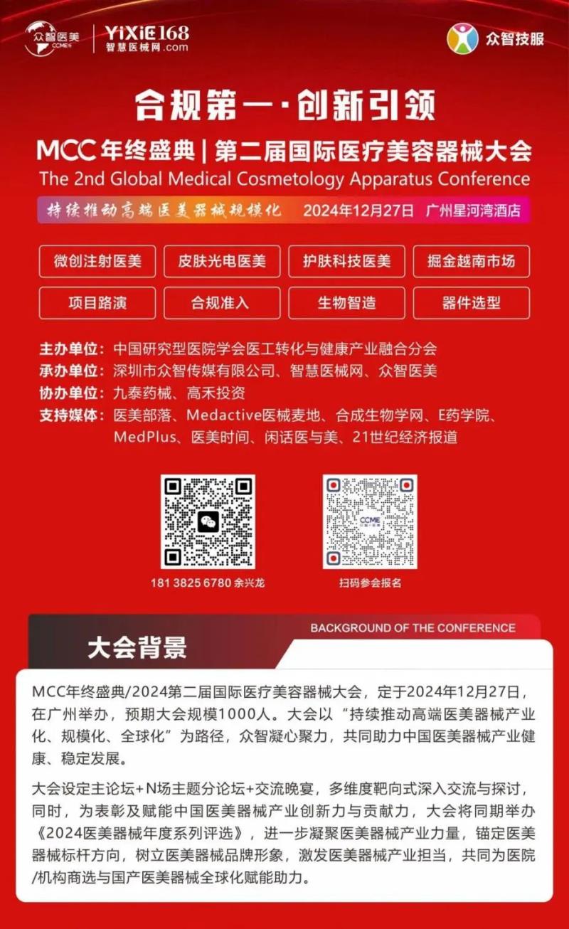 2024年12月27日,MCC年終盛典/2024第二屆國(guó)際醫(yī)療美容器械大會(huì)將在廣州星河灣酒店隆重舉辦。本屆大會(huì)以“持續(xù)推動(dòng)高端醫(yī)美器械產(chǎn)業(yè)化、規(guī)模化、全球化”為主題,眾智凝心聚力,共同助力中國(guó)醫(yī)美器械產(chǎn)業(yè)健康、穩(wěn)定發(fā)展。