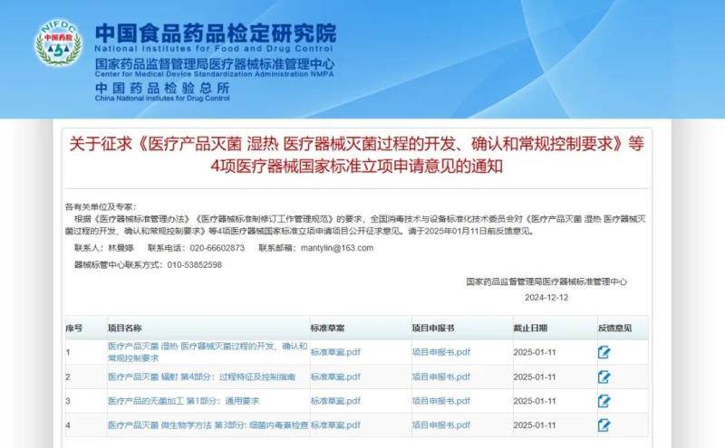 12月12日,國(guó)家藥監(jiān)局醫(yī)療器械標(biāo)管中心發(fā)布《醫(yī)療產(chǎn)品滅菌濕熱醫(yī)療器械滅菌過(guò)程的開(kāi)發(fā)、確認(rèn)和常規(guī)控制要求》《醫(yī)療產(chǎn)品滅菌 輻射 第4部分:過(guò)程特征及控制指南》《醫(yī)療產(chǎn)品的無(wú)菌加工第1部分:通用要求》《醫(yī)療產(chǎn)品滅菌 微生物學(xué)方法 第3部分:細(xì)菌內(nèi)毒素檢查》共4項(xiàng)醫(yī)療器械國(guó)家標(biāo)準(zhǔn)立項(xiàng)申請(qǐng)意見(jiàn)的通知,同時(shí)隨附了各項(xiàng)標(biāo)準(zhǔn)草案,并向社會(huì)公開(kāi)征求意見(jiàn)。