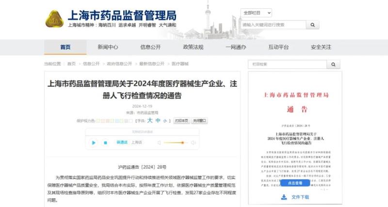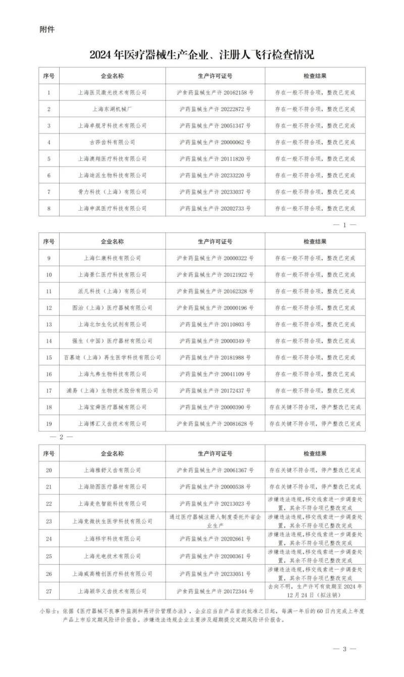 12月19日,上海市藥監(jiān)局發(fā)布《關(guān)于2024年度醫(yī)療器械生產(chǎn)企業(yè)、注冊人飛行檢查情況的通告》,其中提到,依據(jù)醫(yī)療器械生產(chǎn)質(zhì)量管理規(guī)范及其現(xiàn)場檢查指導(dǎo)原則等,該局組織對上海市醫(yī)療器械生產(chǎn)企業(yè)開展了飛行檢查,發(fā)現(xiàn)27家企業(yè)存在不同程度問題,其中17家企業(yè)存在一般不符合項,4家企業(yè)存在關(guān)鍵不符合項,5家企業(yè)涉嫌違法違規(guī),另有一家企業(yè)去向不明。其中有一點(diǎn)值得注意的是,涉嫌違法違規(guī)企業(yè)主要涉及超期提交定期風(fēng)險評價報告。本次“飛檢”情況具體明細(xì)如下: