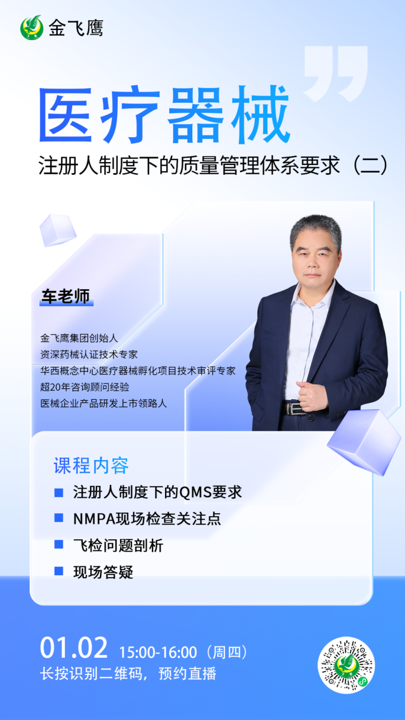 金飛鷹直播培訓(xùn)簡介 金飛鷹直播培訓(xùn),是每周一次的固定培訓(xùn)欄目,優(yōu)選金飛鷹國內(nèi)外資深注冊/項(xiàng)目老師定期為大家講解醫(yī)療器械注冊相關(guān)知識,解答大家在醫(yī)療器械注冊過程中的諸多疑問。 此前我們已為大家?guī)硇掳驷t(yī)療器械生物學(xué)評價標(biāo)準(zhǔn)、新版醫(yī)療器械風(fēng)險管理標(biāo)準(zhǔn)、醫(yī)療器械軟件注冊、醫(yī)療器械質(zhì)量管理體系提升技巧等共計109次線上培訓(xùn)課程,有興趣的可點(diǎn)擊視頻號直播回放進(jìn)行查看~另外大家也一定很關(guān)注接下來的培訓(xùn)主題,相關(guān)培訓(xùn)預(yù)告我們會陸續(xù)添加至視頻號,請大家持續(xù)關(guān)注哦!