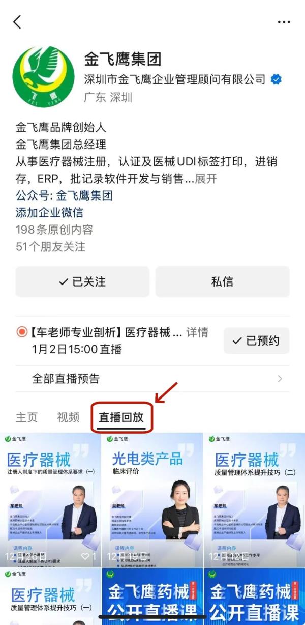 往期直播培訓(xùn)課程支持回放,關(guān)注“金飛鷹藥械咨詢服務(wù)”視頻號并點(diǎn)擊視頻號主頁,即可查看“直播回放”哦~