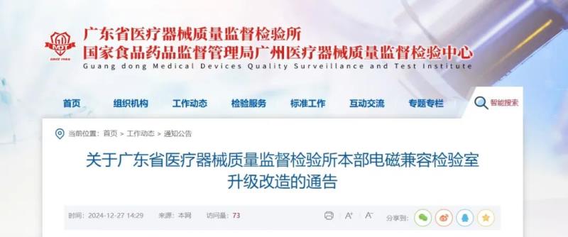 近日,廣東省醫(yī)療器械質(zhì)量監(jiān)督檢驗所發(fā)布通告稱,該所本部電磁兼容檢驗室將進行實驗室升級改造及屏蔽室、暗室等設(shè)施維修保養(yǎng),期間屏蔽室、暗室等全部設(shè)施場地將被圍蔽施工,無法正常使用,相關(guān)檢驗設(shè)備也將暫停使用。受此影響,對2024年12月30日2025年1月20日期間受理的送檢廣州本部電磁兼容檢驗室的檢驗任務(wù),其檢驗周期將在原有周期基礎(chǔ)上增加15個工作日。