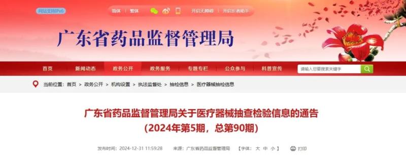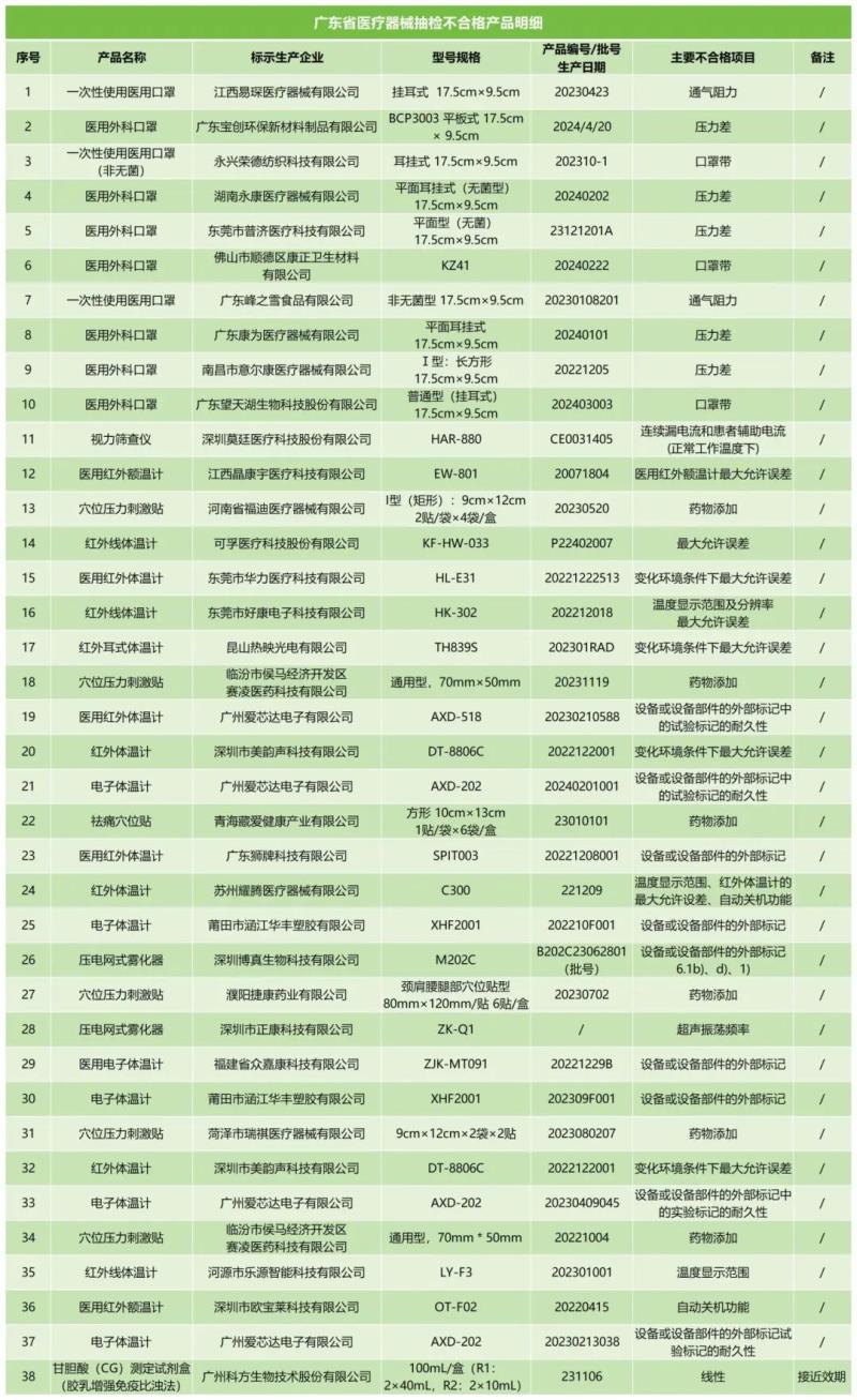 12月31日,廣東藥監(jiān)局發(fā)布《關(guān)于醫(yī)療器械抽查檢驗(yàn)信息的通告(2024年第5期,總第90期)》,我們通過(guò)查看通告中的附件發(fā)現(xiàn),本次共抽查檢驗(yàn)了996批次產(chǎn)品,其中有38批次不符合規(guī)定,包括醫(yī)用外科口罩、視力篩查儀、穴位壓力刺激貼、醫(yī)用紅外額溫計(jì)等產(chǎn)品,不符合規(guī)定產(chǎn)品具體明細(xì)如下: