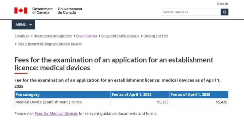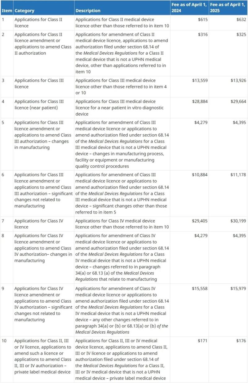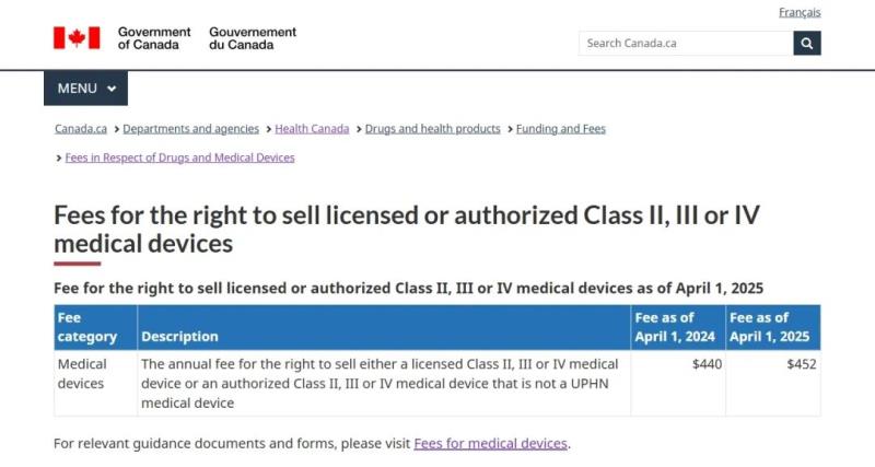 近日,加拿大衛(wèi)生部在其官網(wǎng)上公布了2025財年(2025年4月1日-2026年3月31日)MDEL申請費用,Ⅱ、Ⅲ、Ⅳ類醫(yī)療器械MDL審核費用以及年度更新費用,較之上一財年均有一定幅度的上漲,具體見下方圖片: