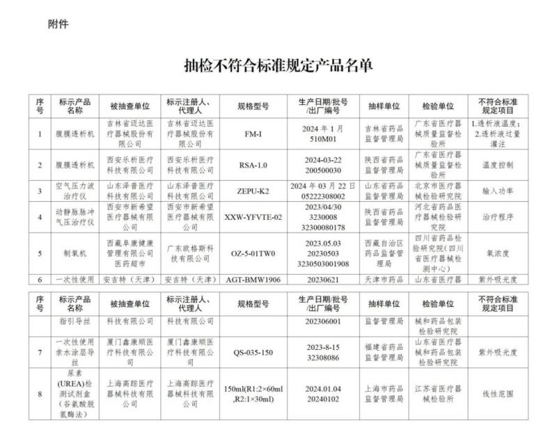 (一)腹膜透析設備2臺:分別為吉林省邁達醫(yī)療器械股份有限公司生產(chǎn),涉及透析液溫度、透析液過量灌注不符合標準規(guī)定;西安樂析醫(yī)療科技有限公司生產(chǎn),涉及溫度控制不符合標準規(guī)定。 (二)肢體加壓理療設備2臺:分別為山東澤普醫(yī)療科技有限公司生產(chǎn),涉及輸入功率不符合標準規(guī)定;西安市新希望醫(yī)療器械有限公司生產(chǎn),涉及治療程序不符合標準規(guī)定。 (三)醫(yī)用分子篩制氧機1臺:廣東歐格斯科技有限公司生產(chǎn),涉及氧濃度不符合標準規(guī)定。 (四)導絲2批:分別為安吉特(天津)科技有限公司、廈門鑫康順醫(yī)療科技有限公司生產(chǎn),涉及紫外吸光度不符合標準規(guī)定。 (五)尿素測定試劑盒1批:上海高蹤醫(yī)療器械科技有限公司生產(chǎn),涉及線性范圍不符合標準規(guī)定。