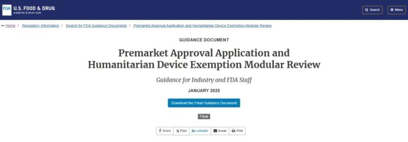 美國當(dāng)?shù)貢r間1月13日,F(xiàn)DA發(fā)布了上市前批準(zhǔn)申請(PMA)和人道主義器械豁免(HDE)模塊審查的最終文件Premarket Approval Application and Humanitarian Device Exemption Modular Review。